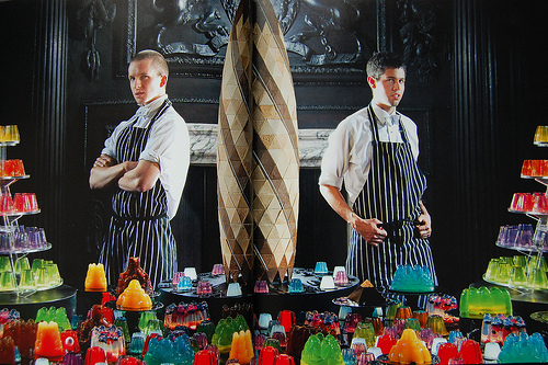 I am endlessly fascinated by this duo, Bompas and Parr, who have made a business and an art out of creating "food experiences". Apparently 2 guys left behind careers in politics and architecture, and now spend their days combining Victorian jelly-making techniques with amazing concepts, to create bespoke jelly moulds and food experiments for events, openings and performances. Some of their projects include a glowing jelly installation, a pyramid of breathable fruit, an artisanal chewing gum factory, a scratch-n-sniff banquet, and an architectural punchbowl, where people rafted over 4 tonnes of Courvoisier. God, how fun does that sound? Not to mention they can make caves out of sugar, and jellies in the shape of parliamentary buildings. We gotta meet these guys.